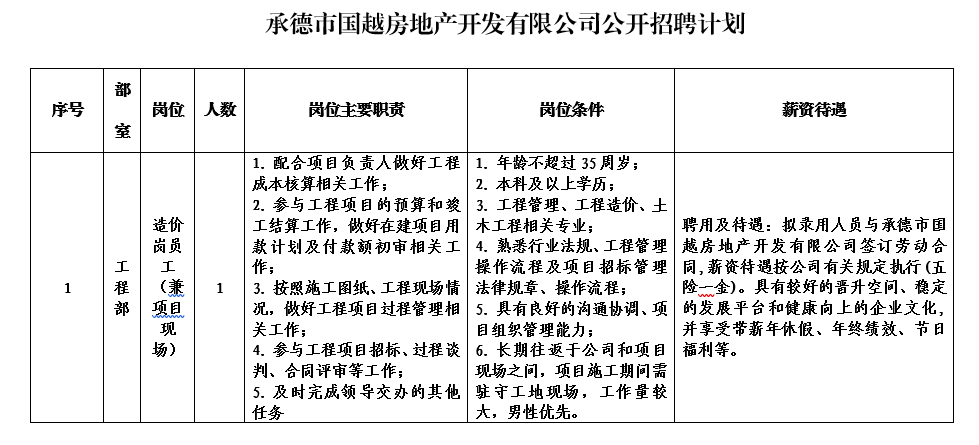 本次擬招聘1個(gè)崗位共計(jì)1人。具體應(yīng)聘條件見附件《承德市國越房地產(chǎn)開發(fā)有限公司公開招聘計(jì)劃表》 。